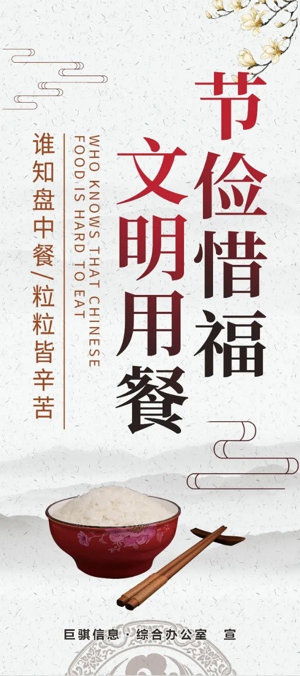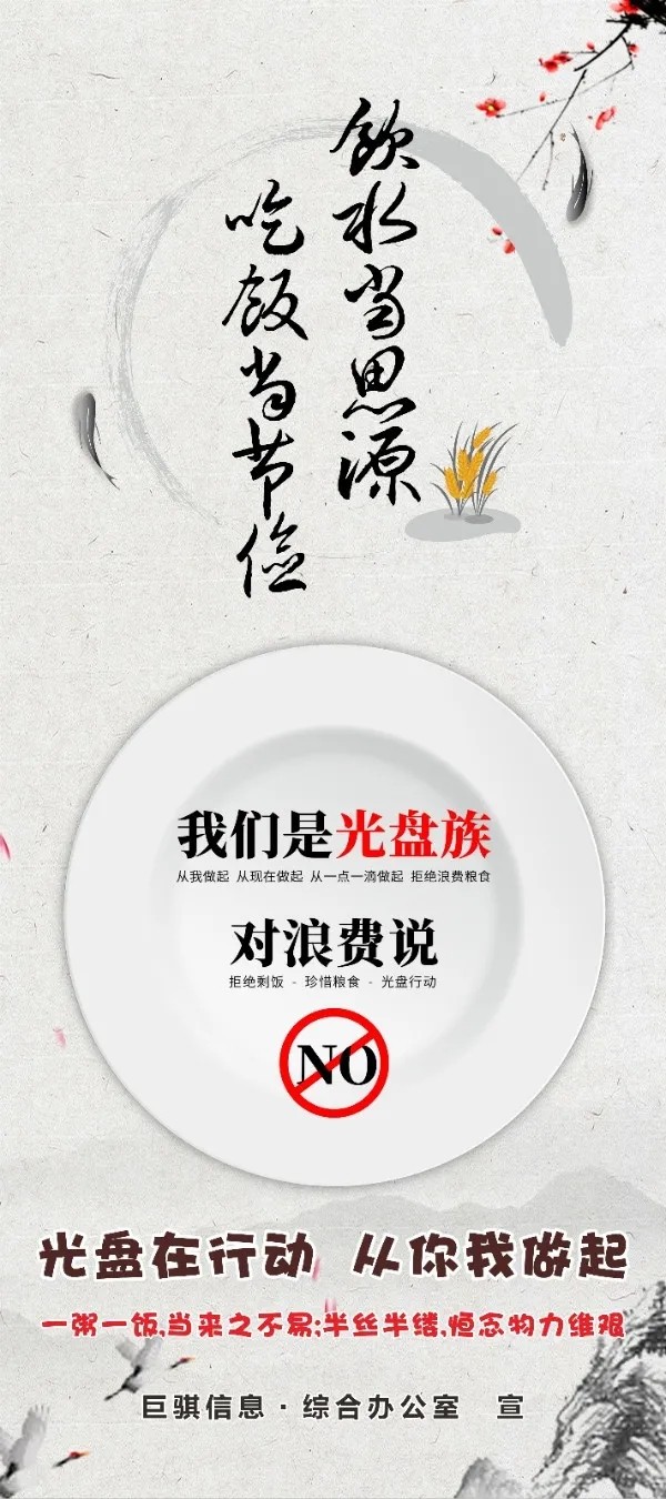 有一種節約叫光盤,有一種公益叫光盤。為熱烈響應習近平總書記 對制止餐飲浪費行為作出的重要指示,進一步弘揚中華民族勤儉節約的美德,8月18日開始,巨騏信息“文明餐桌,光盤行動”系列活動正式啟動。“一粥一飯,當思來之不易;半絲半縷,恒念物力維艱”。一個國家、一個民族對節儉和浪費的態度,折射出其價值標準和文明程度。只有讓勤儉節約風氣在全社會成為深入人心的理念,轉化為人們的具體行動、社會風尚。每一粒糧食都值得被珍惜,讓我們一起加入“光盤行動”的行列,堅決拒絕“舌尖上的浪費”,爭做節儉風尚的傳播者、實踐者、示范者。